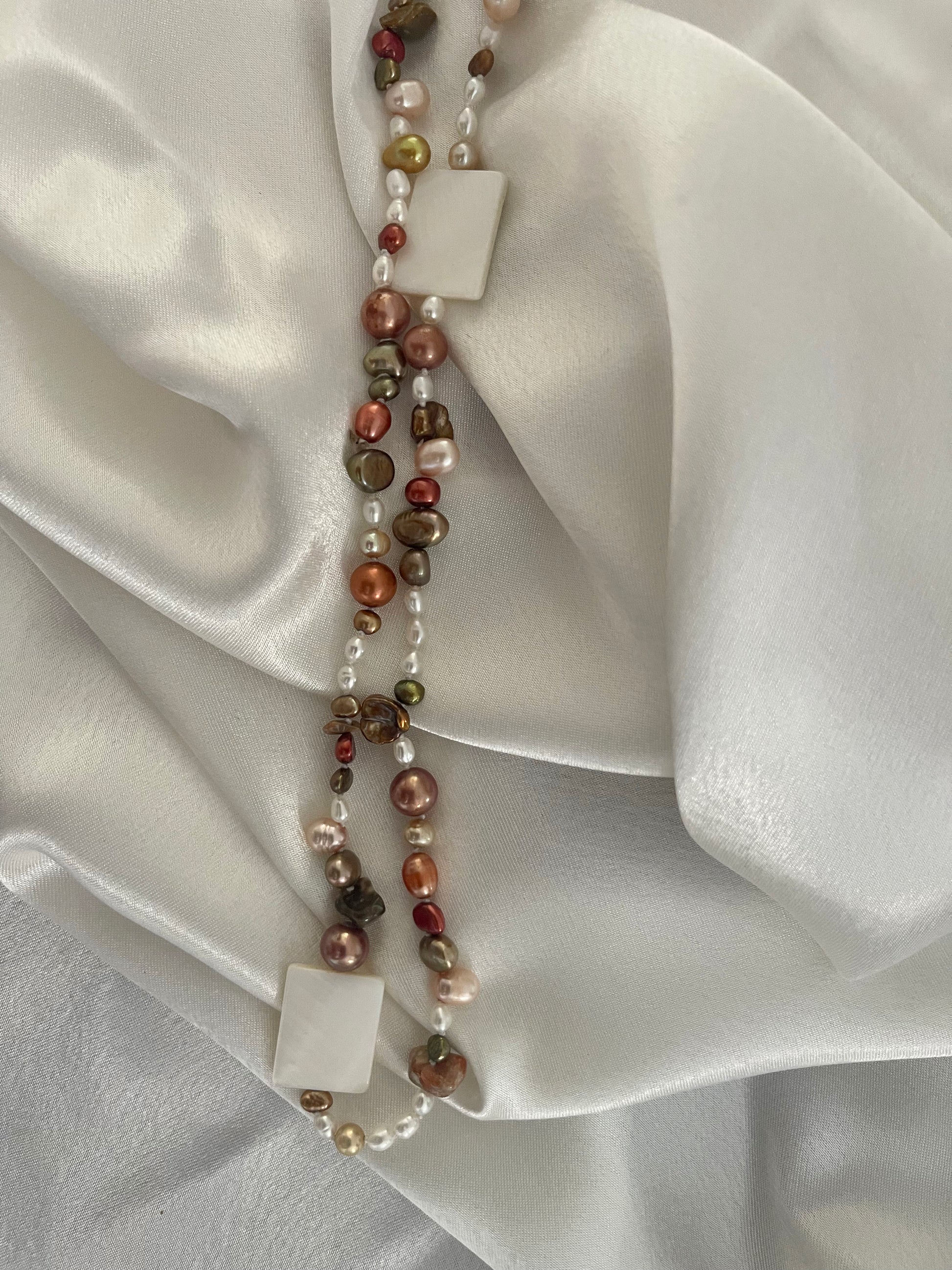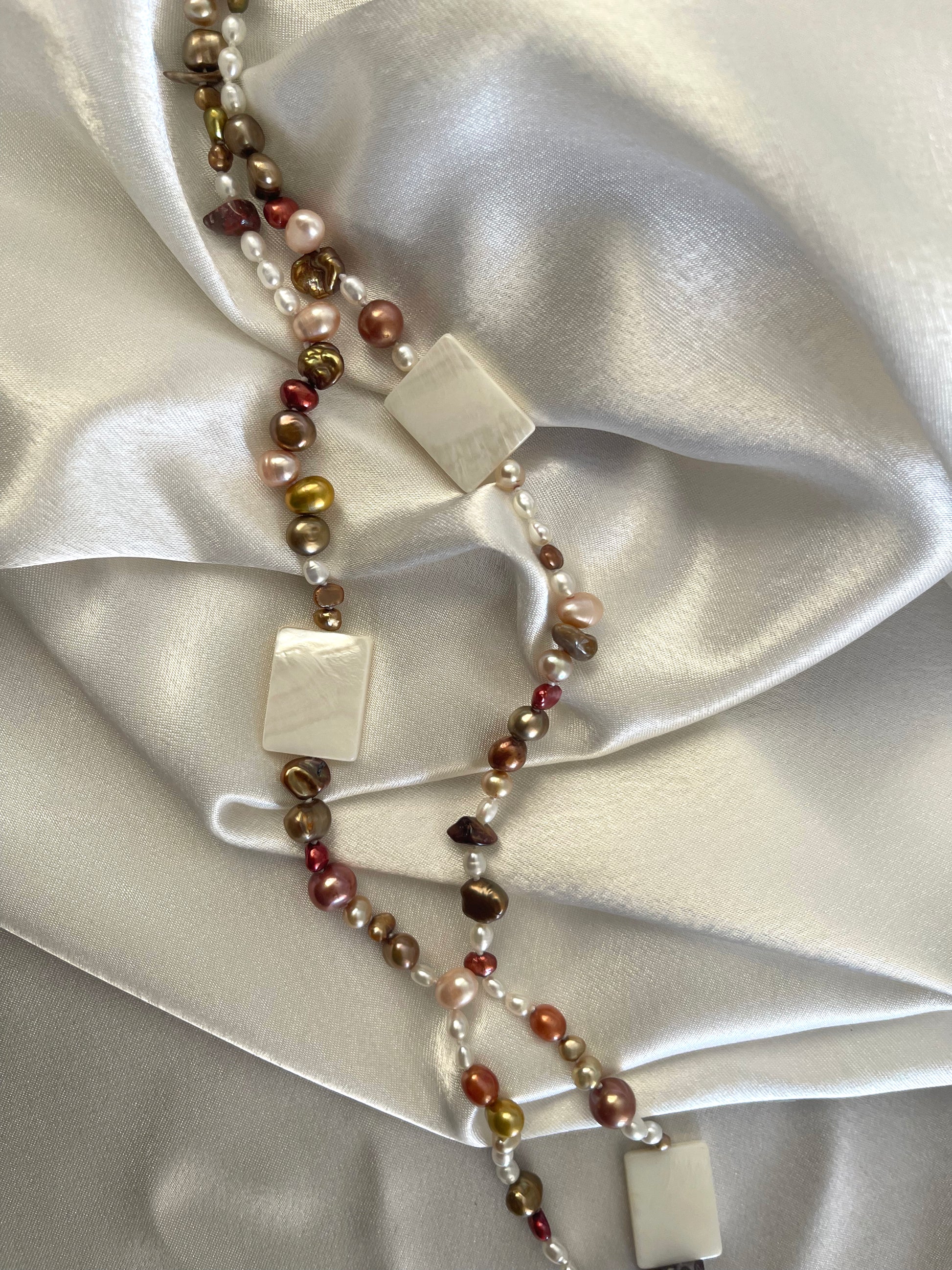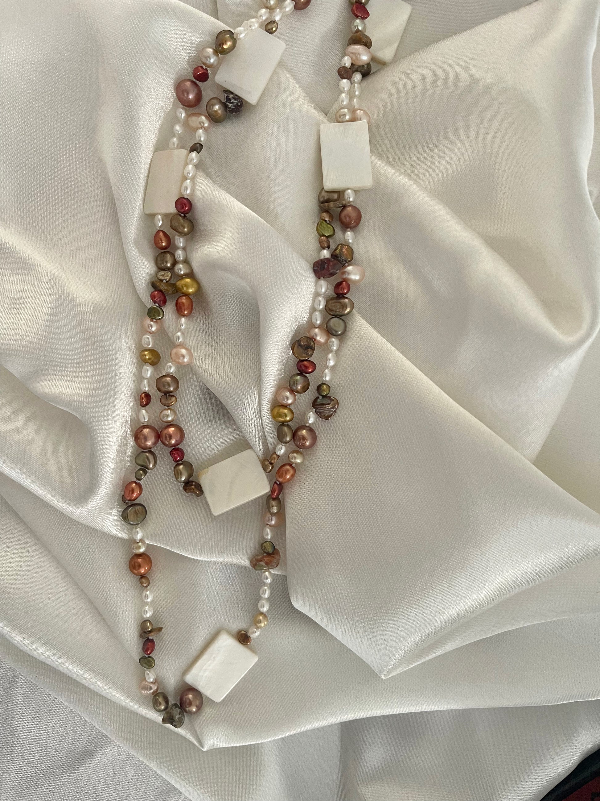 Necklace loop (50cm - 100cm loop) - tiny white rice pearls with irregular potato shapes, round bronze pearls and champagne keshi pearls along with rectangle mother of pearl shell