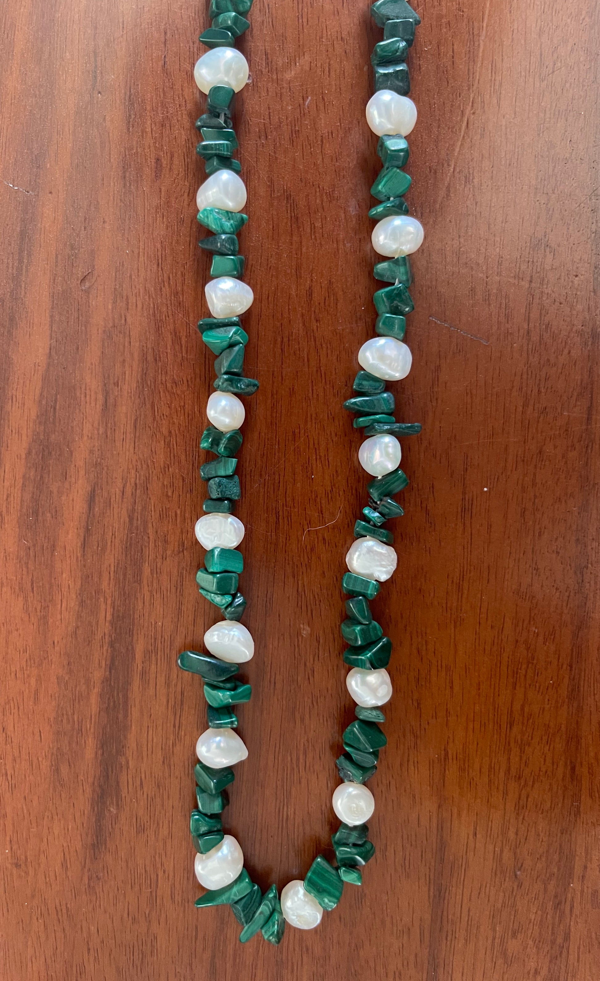 This gorgeous necklace is handmade in Brisbane with Freshwater pearls of round shape and various sizes and shapes of malachite.